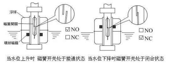 螺紋連接 產(chǎn)品規(guī)格︰ PP,PVDF材質(zhì)可適用于強酸鹼場所;SUS304/316金屬材質(zhì)適用于高溫高壓桶槽 接線盒規(guī)格*齊全,有塑膠、鋁合金、不銹鋼防爆型,防護等級IP-65以上 接點容量50W/250VAC SPST或40W/250VAC SPDT 接續(xù)法蘭有JIS,DIN,ANSI規(guī)格;牙口有NPT,PF,BSP等規(guī)格 可做多點控制、安裝容易、節(jié)省成本 特殊規(guī)格亦可配合客戶需求訂 。下圖為常閉(NC)及常開(NO)時浮球開關的相關位置。不銹鋼浮球液位開關工作原理圖